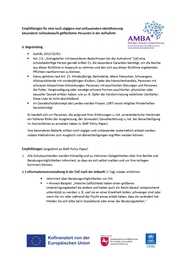 AMBA+ Empfehlungen für eine noch zügigere und umfassendere Identifizierung besonderer Schutzbedarfe geflüchteter Personen in der Aufnahme